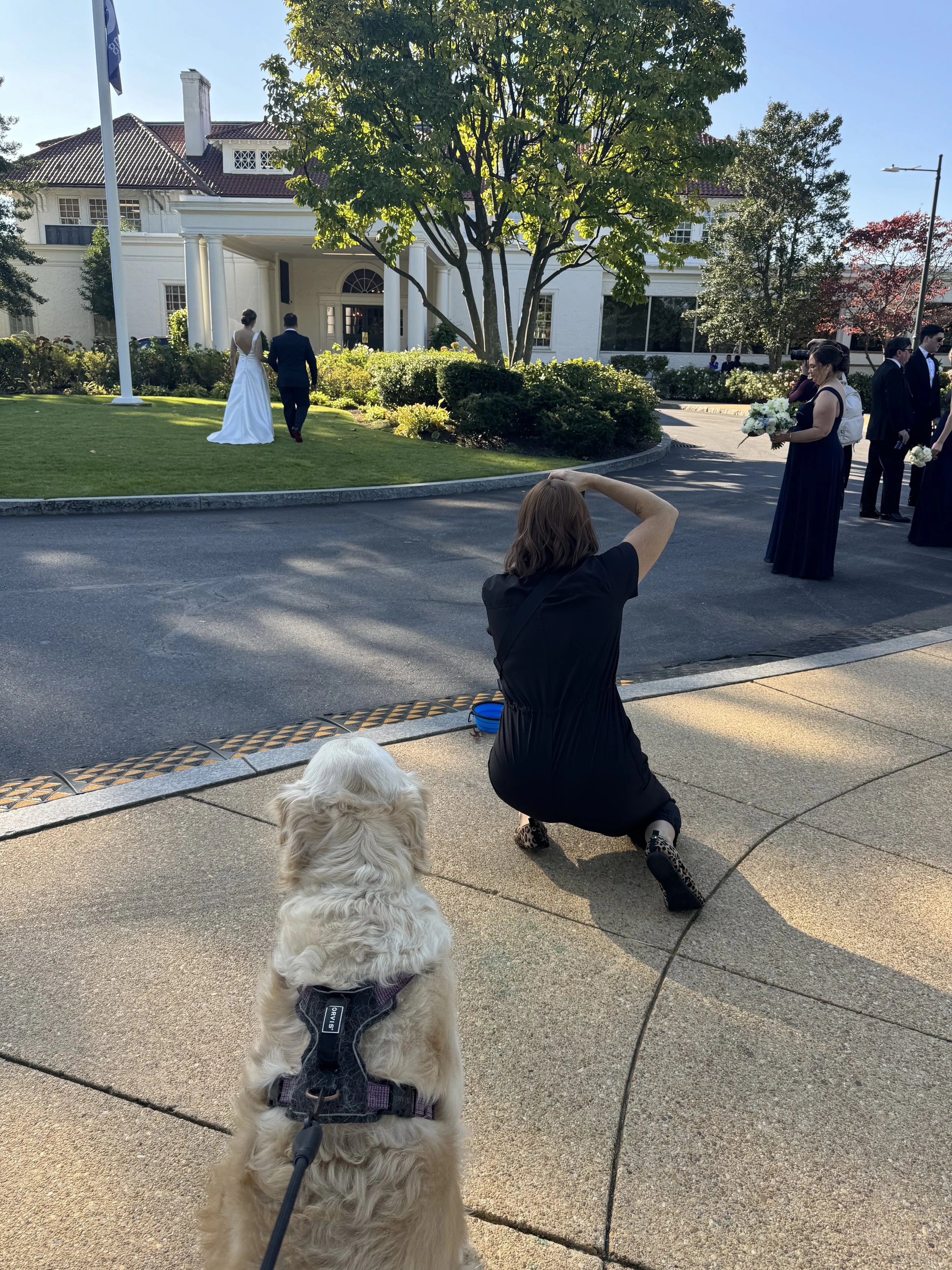Holding back the dog so she doesn’t jump on the bride and groom